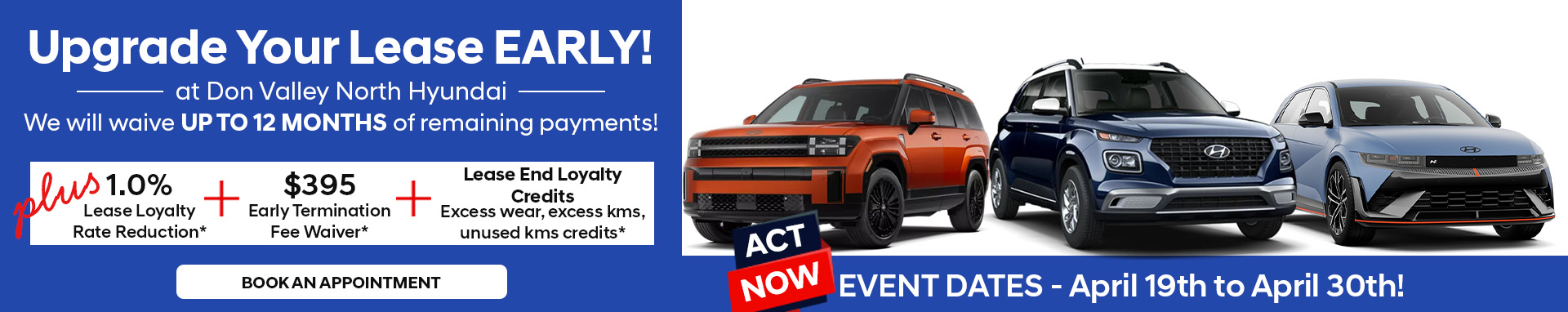 *Up to 12 Months of Lease Payments Waived - Customers may qualify to have up to 12 remaining lease payments waived when they lease or finance a new Hyundai vehicle through Don Valley North Hyundai and Hyundai Financial Services. The number of payments waived depends on remaining term, current model, and credit approval. Offer valid for select in-stock models only and cannot be combined with certain other offers. Proof of current lease and remaining term required. Additional conditions may apply. See dealer for full eligibility details.